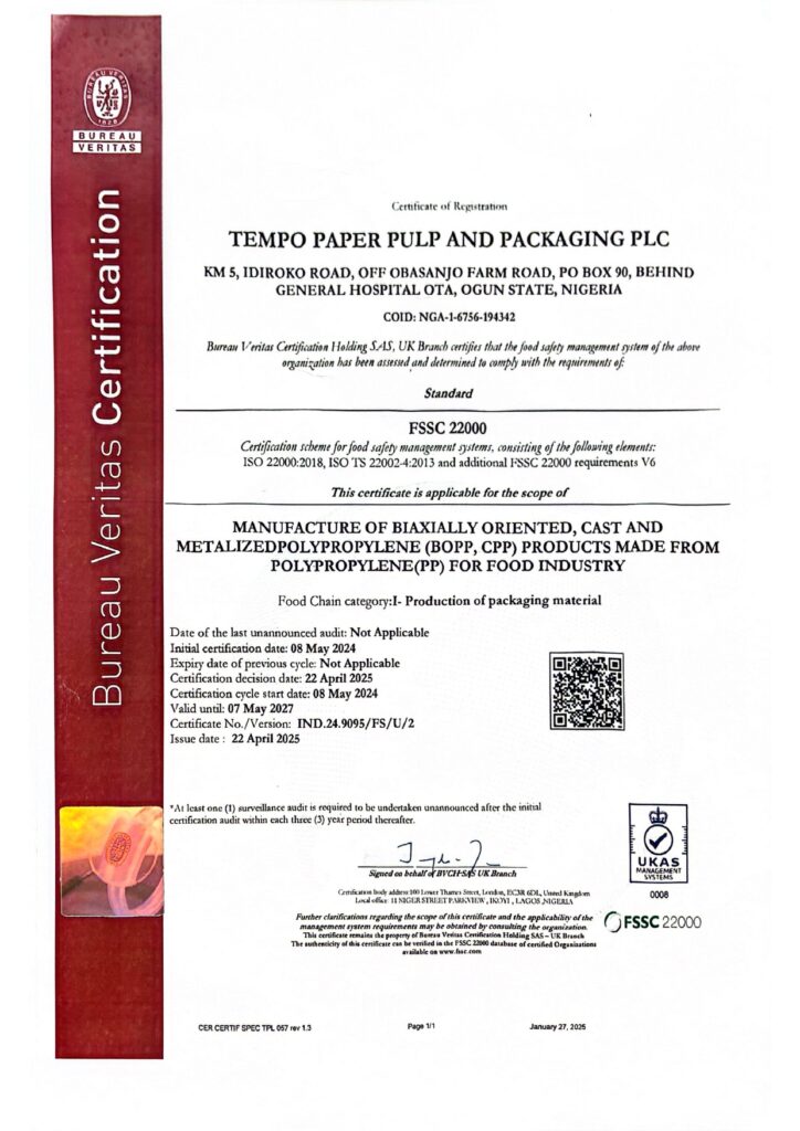 The food safety management system of Tempo Paper Pulp & Packaging Plc has been assessed by Bureau Veritas Certification Holding SAS – UK Branch and found to comply with the requirements of FSSC 22000 (consisting of ISO 22000:2018, ISO TS 22002-4:2013 Part 4: Food Packaging manufacturing & Additional FSSC 22000 requirements V6) international standards. The food safety management system is applicable to manufacturing BOPP (Biaxially Oriented Polypropylene), CPP (Cast Polypropylene and Metallized films) made for Food Industry.