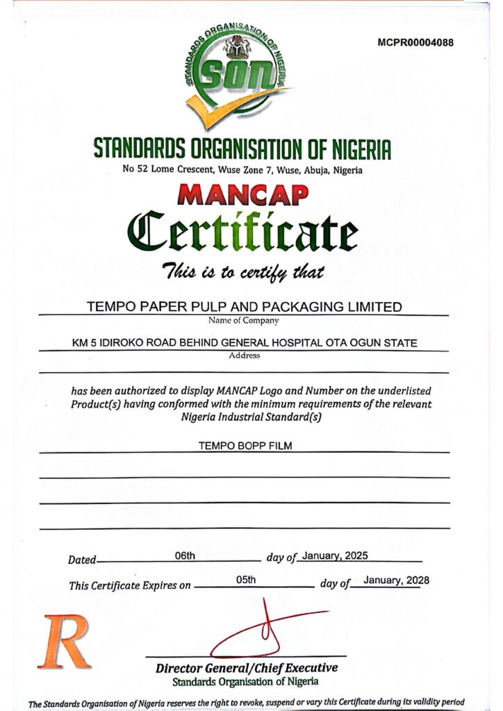 The quality standard of Tempo BOPP Films has been assessed by the mandatory conformity assessment program of SON and found to meet the minimum requirements of relevant Nigerian industrial standard.