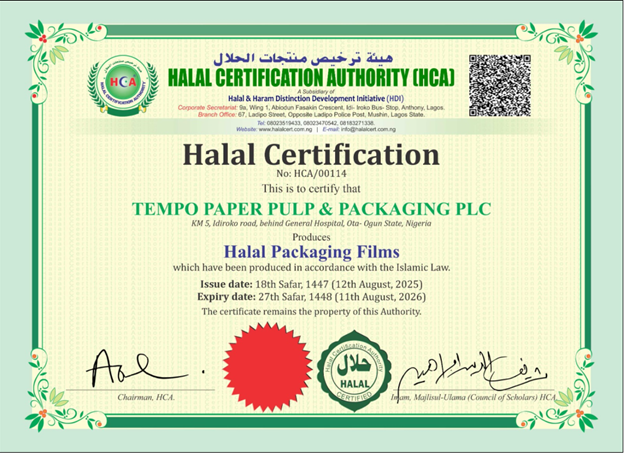 At Tempo Paper Pulp and Packaging Plc, we remain focused on continuous improvement and adherence to globally accepted standards. Securing this certification is a strategic milestone that strengthens our ability to serve diverse markets while upholding our reputation as a responsible and trusted industry leader.